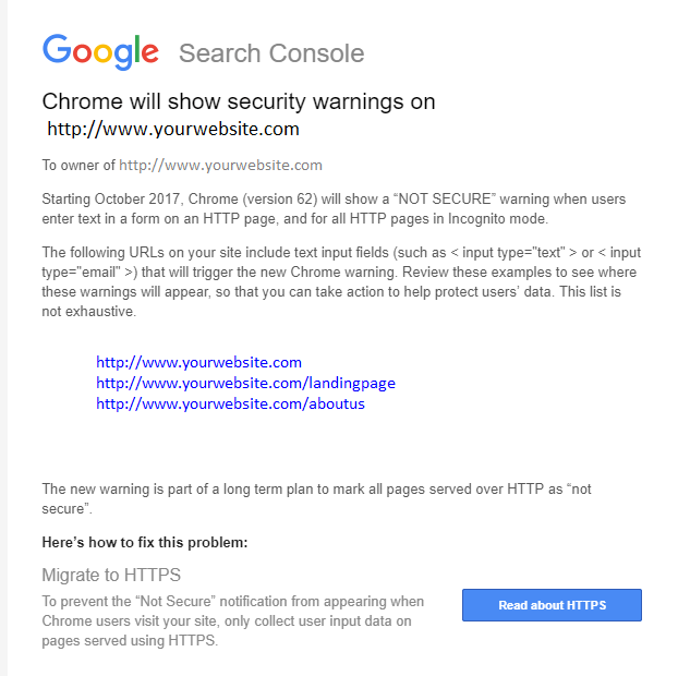 None of this is really news though. What is news is that Google Webmaster Tools recently started sending notices stating that in October the Chrome browser will show security warnings if your website is not secured with SSL. This is a huge shift. We’ve gone from having a secured site with https as a positive ranking factor to not having a secured site with https being a a hue detriment to visitors. I think it’s safe to expand on that last statement and assume that having a non-secure site will soon be a negative ranking factor.