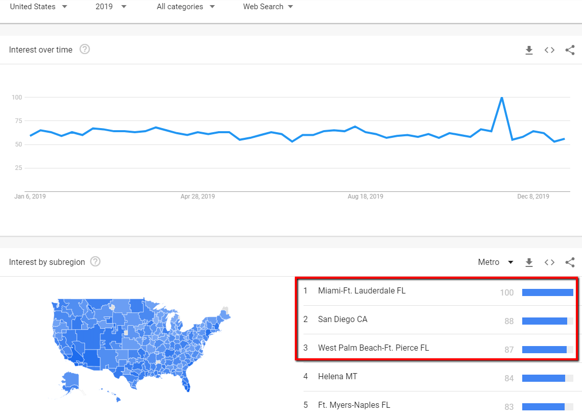 Now if you look at 2019 as a whole, the metros change. Now you have Miami, San Diego, and West Palm Beach in the top 3, which makes more sense as most think of these areas as hot spots for aesthetics.